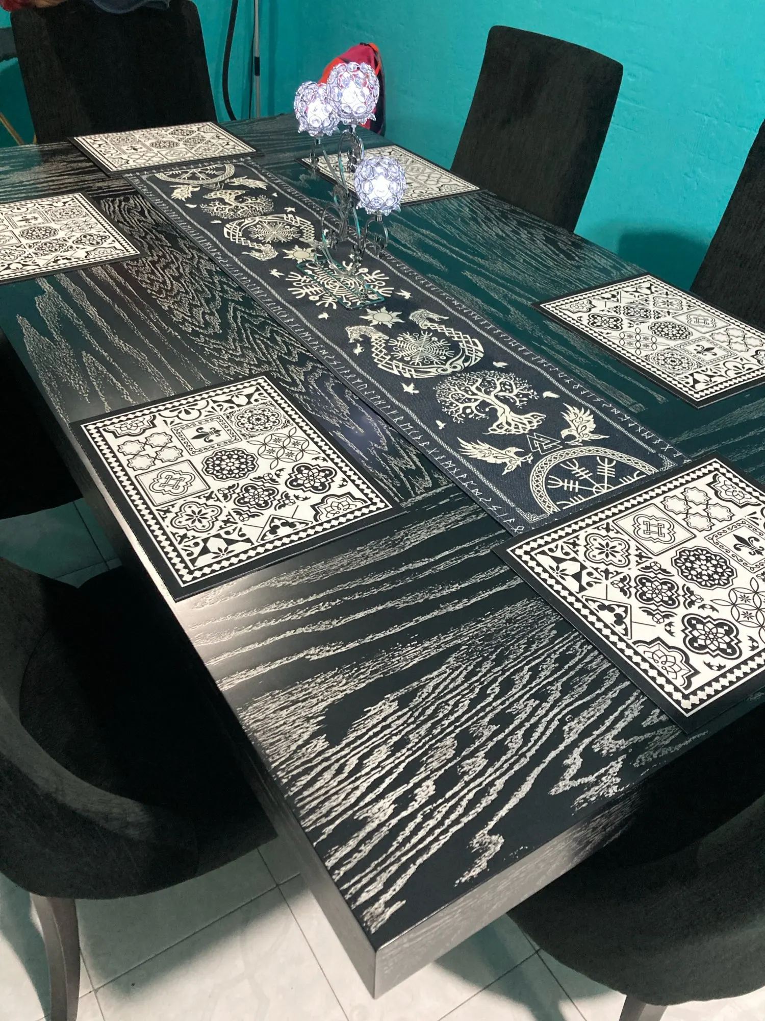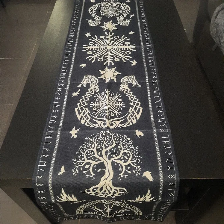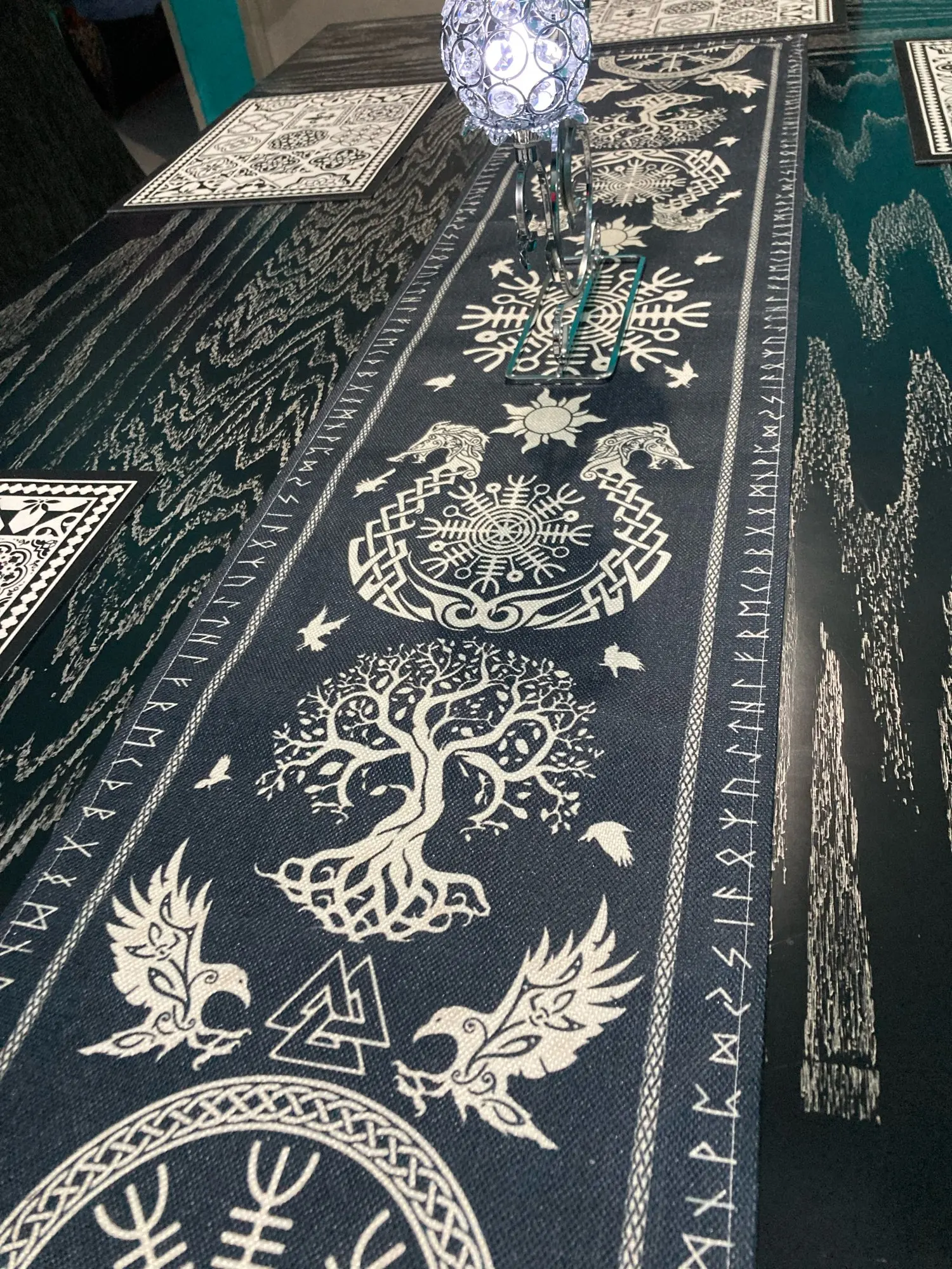 Aegishjalmur, (viking védelmi rúnakör) Valknut, szimbólumokkal, Yggdrasil (életfa) holló szimbólumokkal díszített viking asztali futó