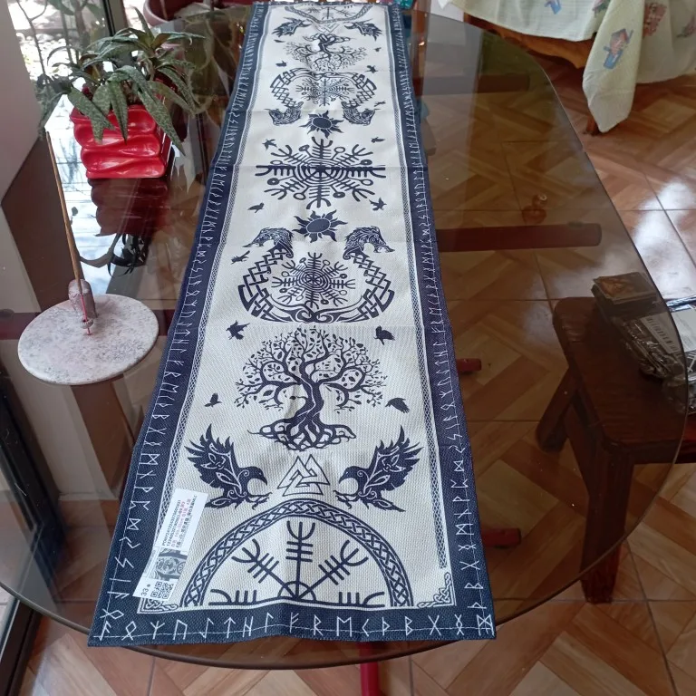 Ez a viking asztalterítő a régi nordikus hagyományokat és szimbolikát ötvözi egy modern, praktikus kiegészítőben. A terítőn olyan erőteljes szimbólumok jelennek meg, mint a Valknut, az Aegishjalmur és a holló, mindegyik egy-egy mély spirituális jelentéssel bír.
