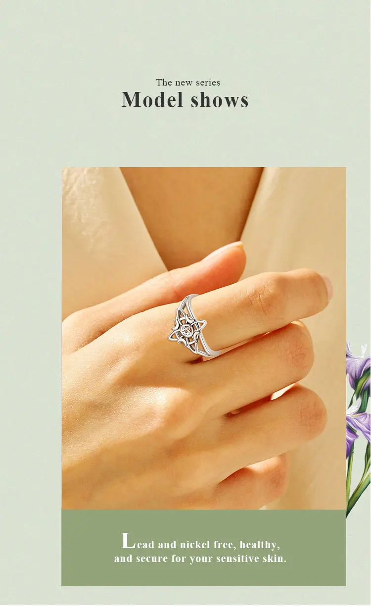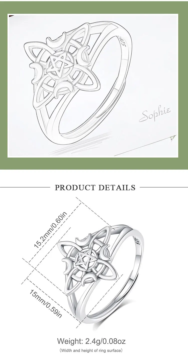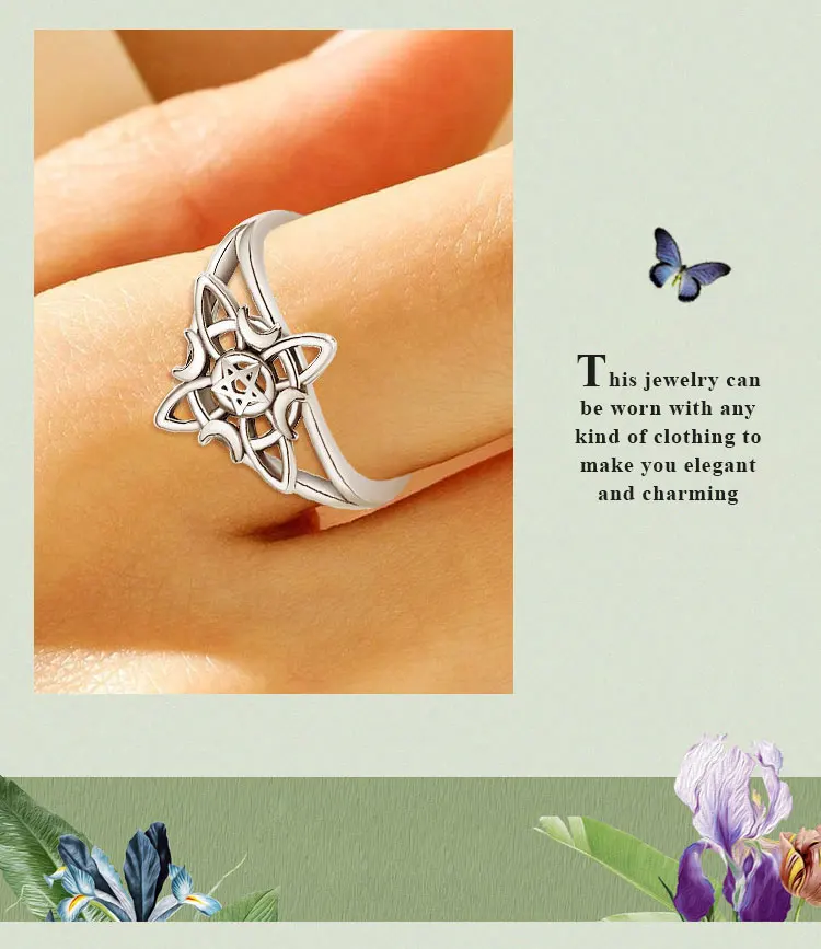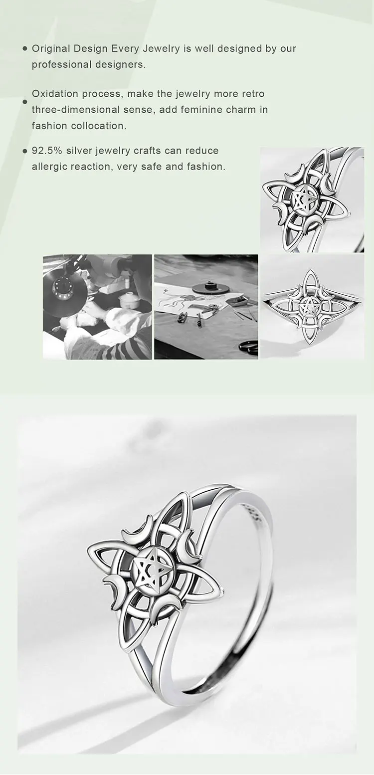 Kelta csomó közepére helyezett pentagramma ezüst gyűrű hold szimbólumokkal