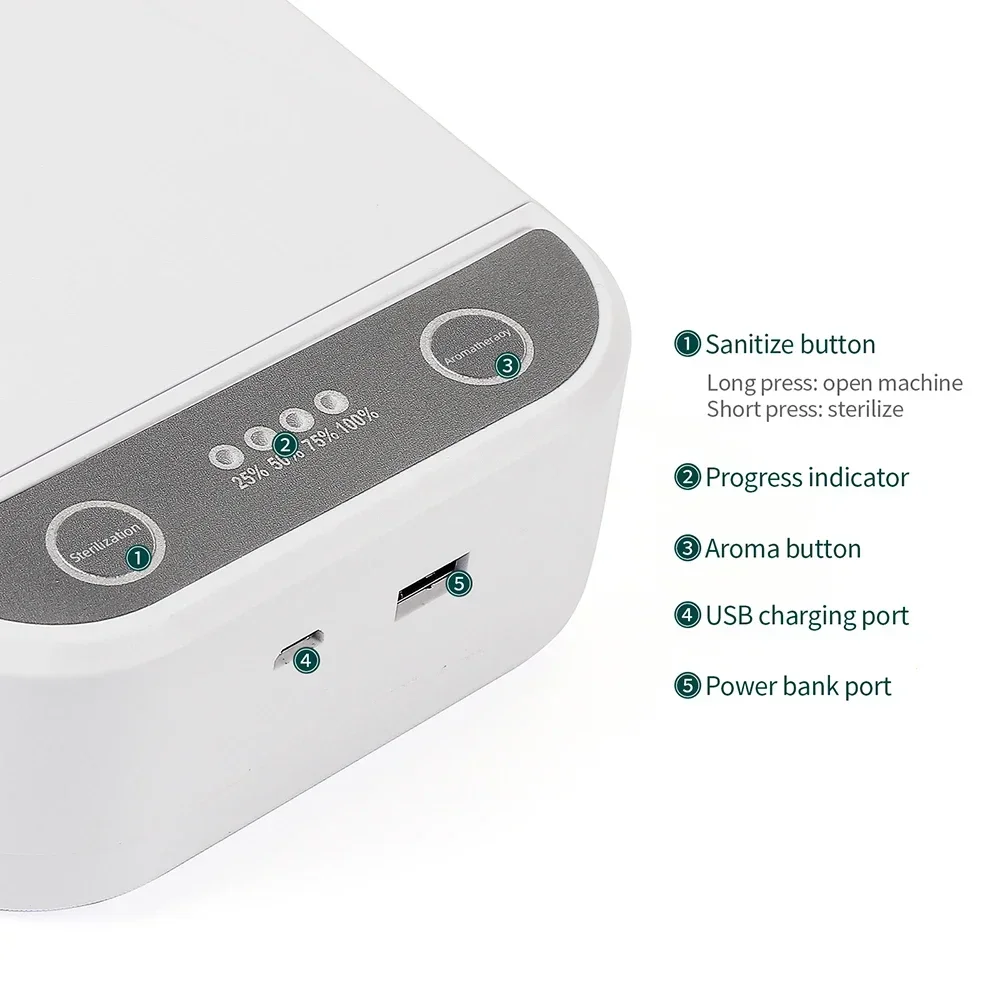 Beépített USB töltőport: Lehetőséget biztosít arra, hogy a telefonodat töltsd, miközben a készülék fertőtleníti azt.