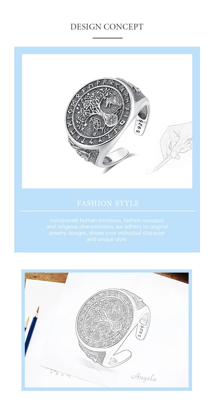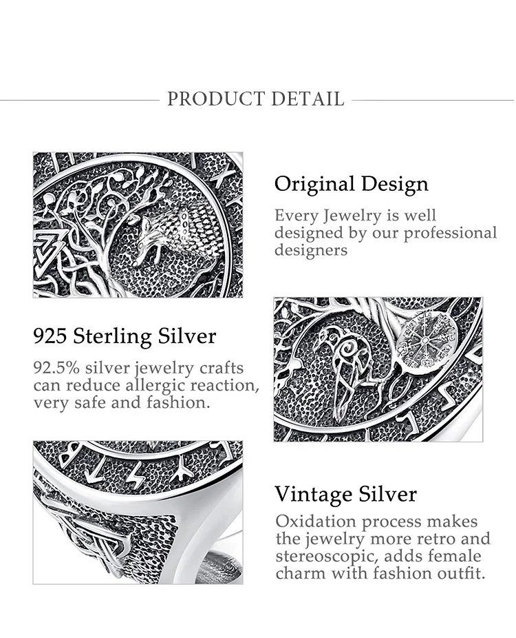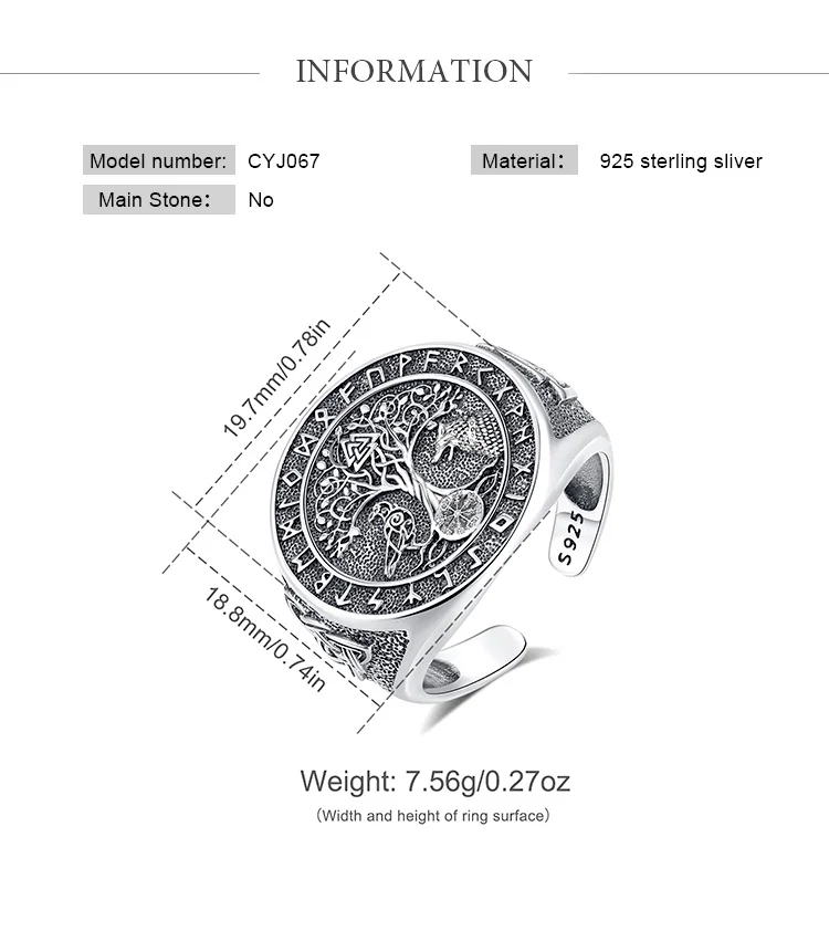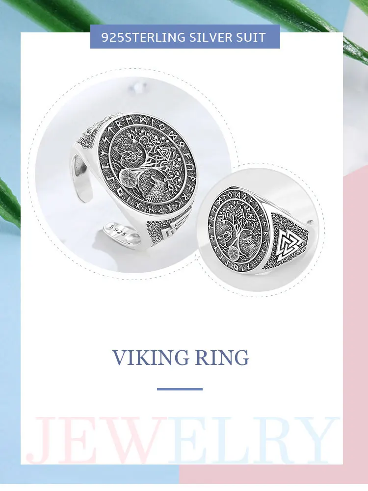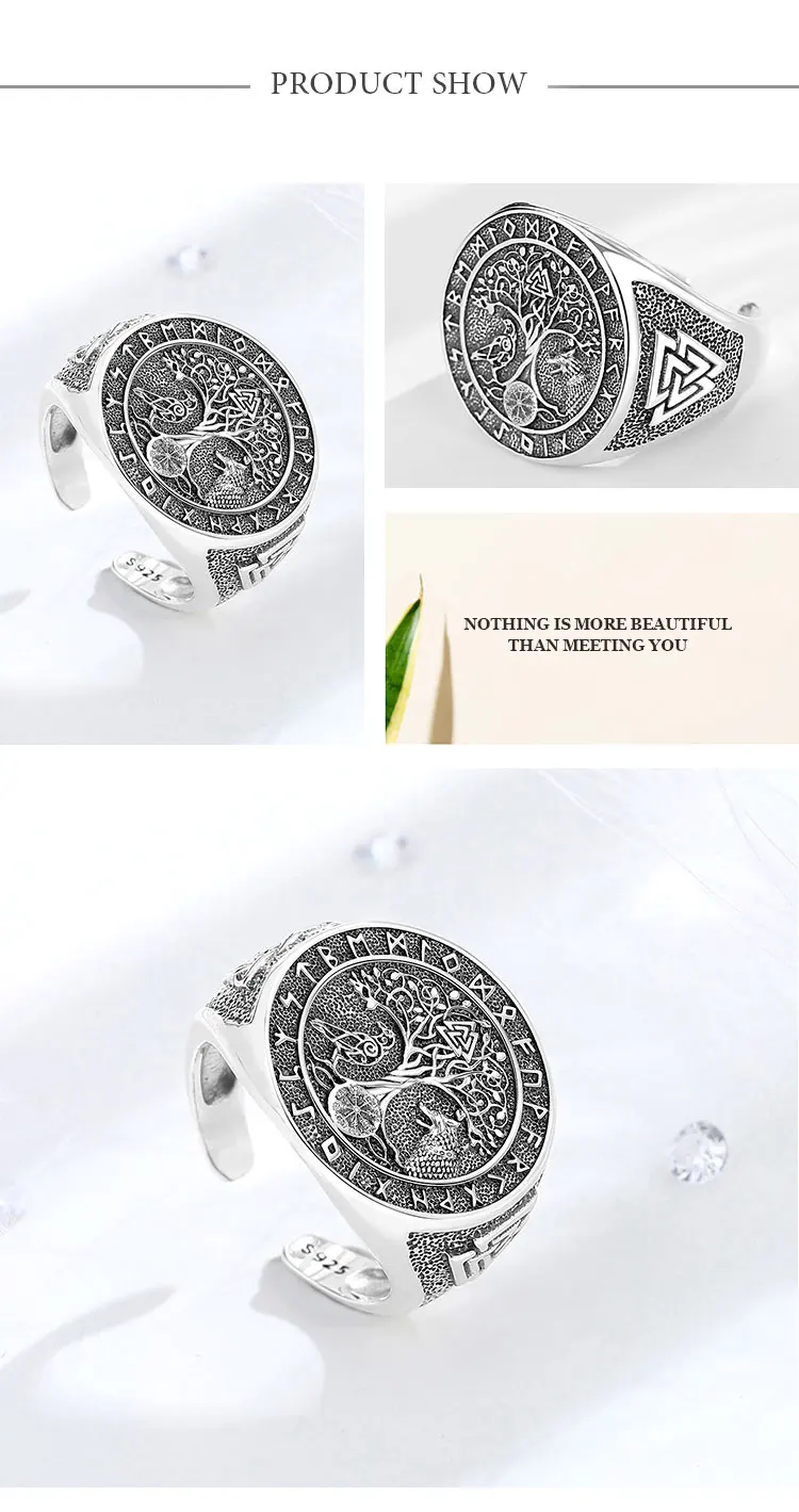 Video! - Állítható viking rúnagyűrű Yggdrasil (életfa) Odin farkasa és hollója motívummal az Elder Futhark rúnákkal körülvéve