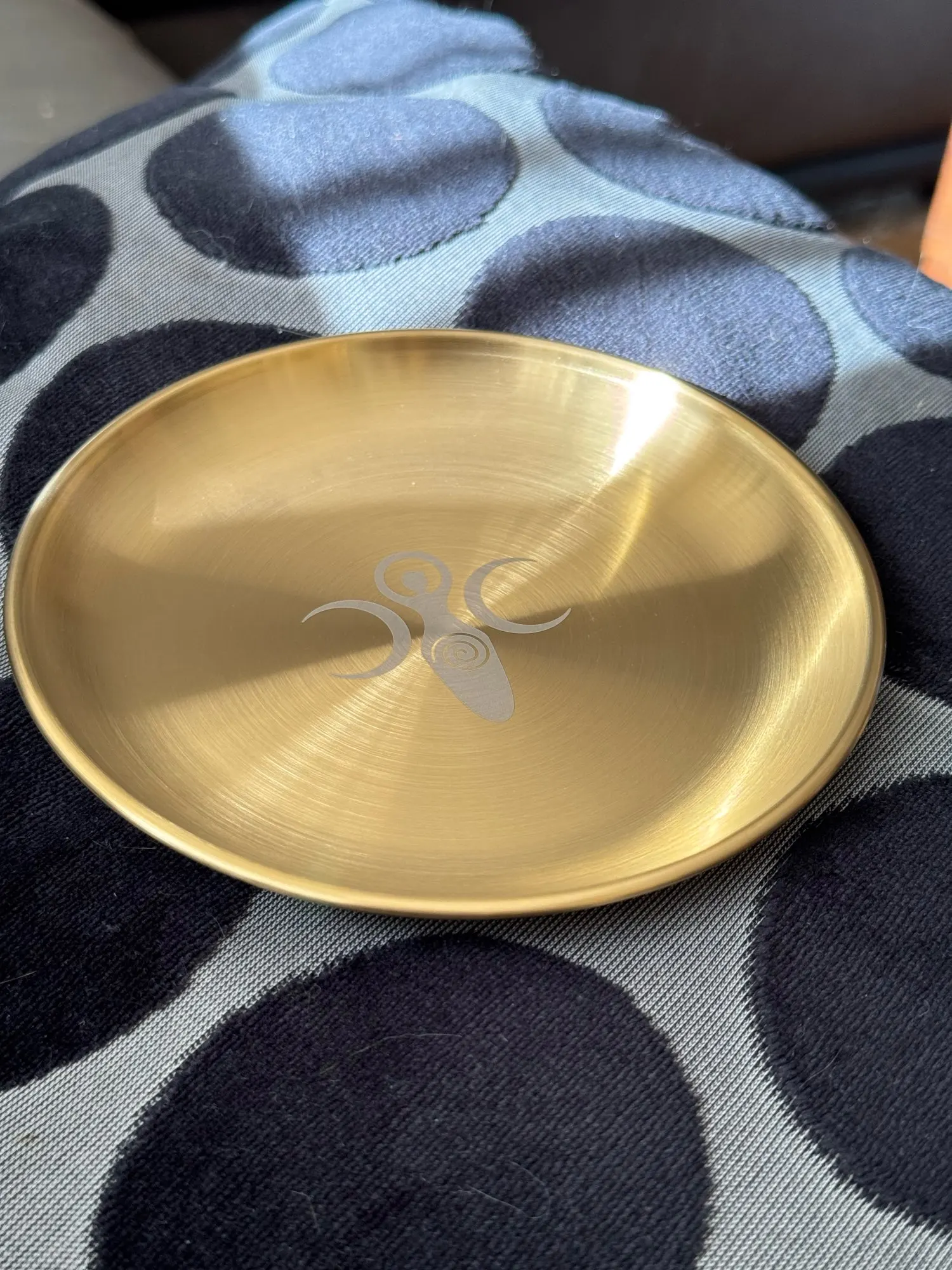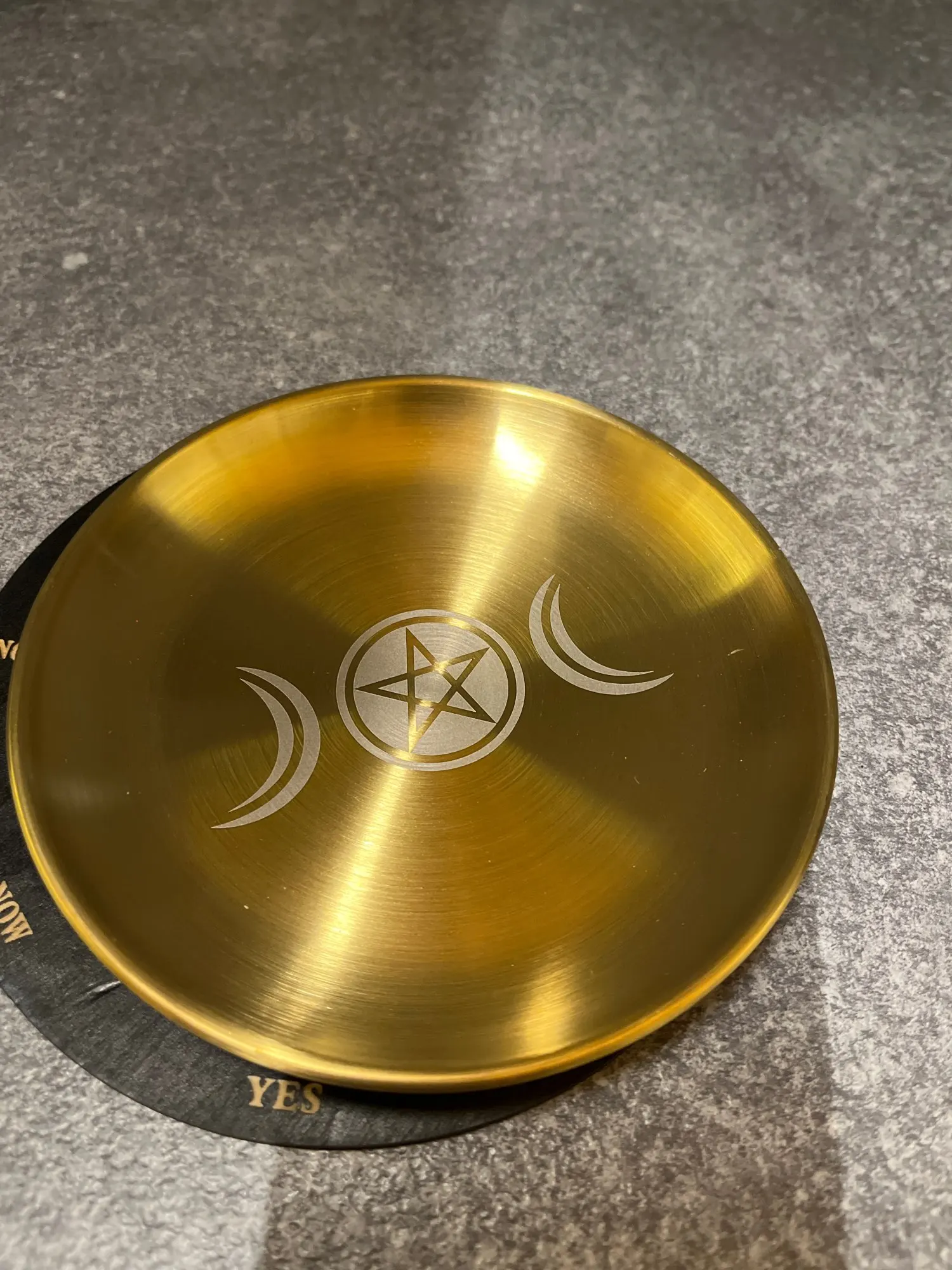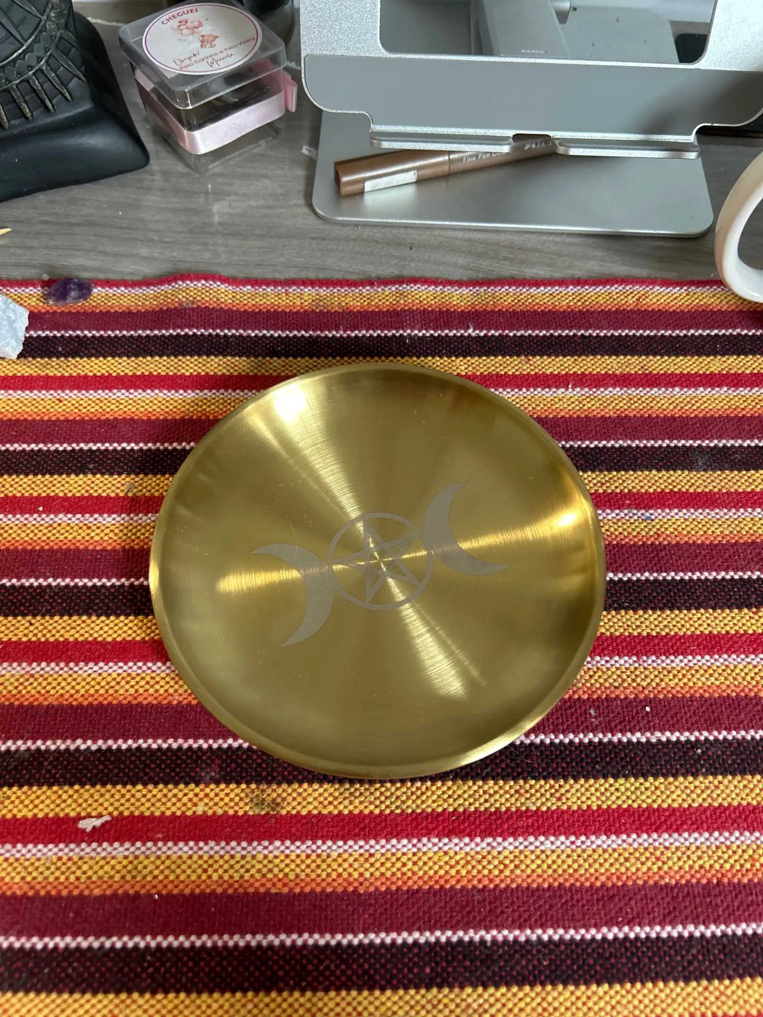 Modern rituális tálcánk sárgaréz felülettel rendelkezik, amelyet misztikus minták díszítenek. Kiválóan alkalmas oltárokhoz, rituálékhoz, imákhoz, füstöléshez, dekorációhoz, gyantához és még sok máshoz.